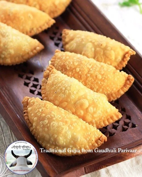 देसी गौ माता के घी, उत्तम गुणवत्ता के खोया, पौष्टिक ड्राई फ्रूट्स और प्राकृतिक देसी खांड से तैयार पारंपरिक गुजिया  ( बिना चाशनी ) @ Rs. 750/- रुपए प्रति किलोग्राम और ₹ 400 प्रति आधा किलो